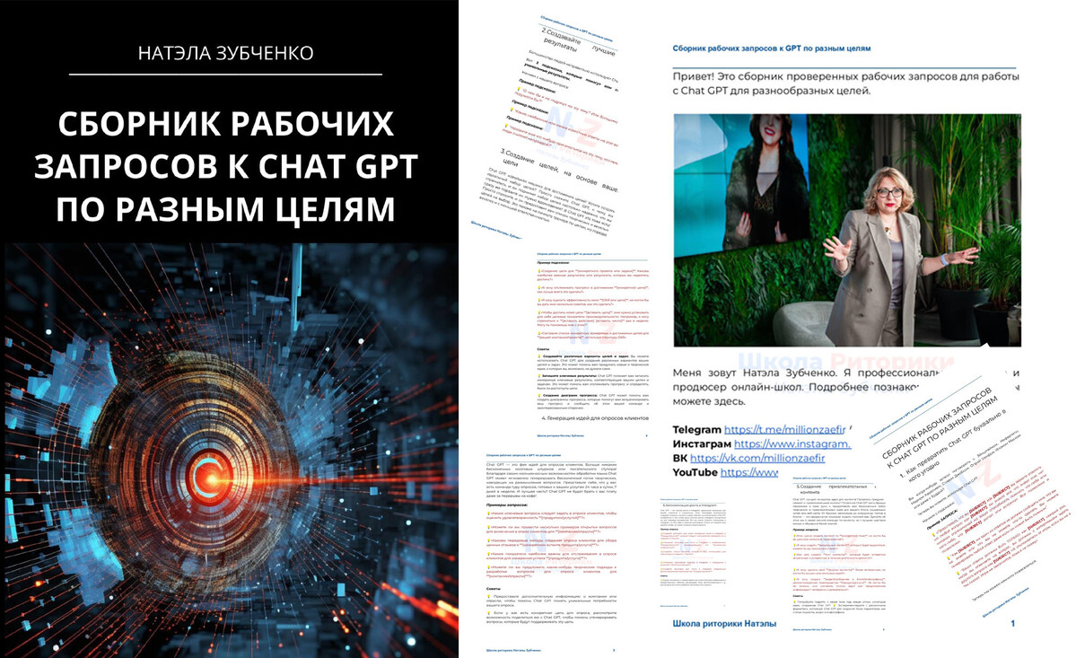 8-страничный pdf со сборником рабочих проверенных запросов по любым целям использования Chat GPT.