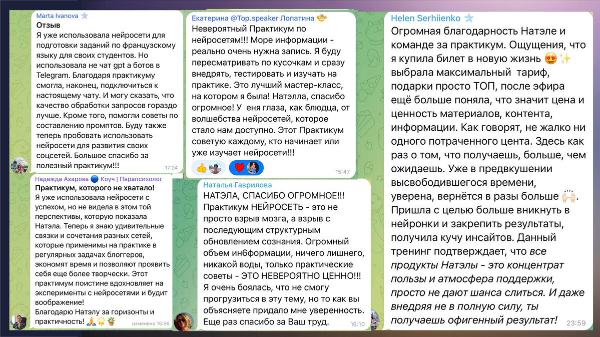 6. Участники впечатлены уровнем автора практикума - Натэлы Зубченко! Они считают ее настоящим профи и экспертом в нейросетях. Отмечают, что Натэла очень доходчиво и простым языком объясняет даже сложные вещи. У нее уникальная способность делать трудные темы понятными даже для новичков! Еще говорят, что уровень подачи материала у Натэлы - высший пилотаж. Она щедро делится своим опытом и знаниями, находит подход к каждому. Короче, Натэлу просто обожают за ее профессионализм и умение увлечь обучением. Она как будто родилась, чтобы учить!